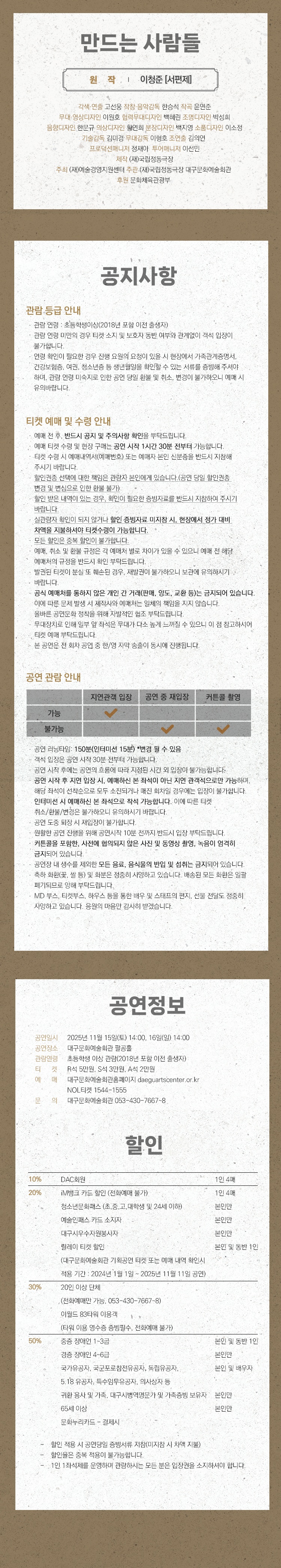 - 릴레이 티켓 할인 / 동반 1인까지 (대구문화예술회관 기획공연 티켓 또는 예매 내역 확인시, 적용 기간 : 2024년 1월 1일 ~ 2025년 11월 11일 공연)