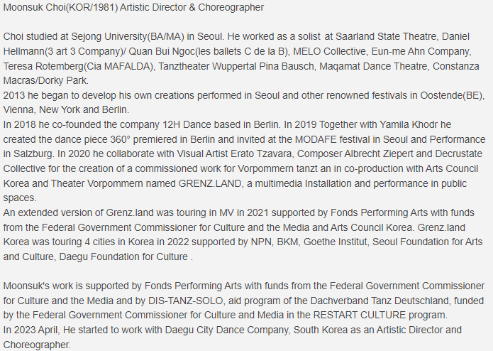 - Previous selected choreographer for the Korea National Contemporary Dance Company's "Step Up" program.